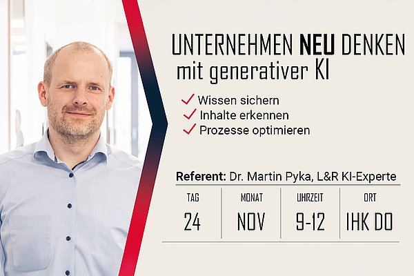 Die IHK zu Dortmund läd Sie herzlich ein, am 24.11.2025 von 09:00 - 12:00 Uhr gemeinsam mit Dr. Martin Pyka, Projektleiter & Consultant bei der Lachmann & Rink GmbH, drei zentrale Anwendungsfelder der generativen KI zu beleuchten und gemeinsam praxisnahe Szenarien zu erproben, die auf den Arbeitsalltag in Unternehmen übertragbar sind: